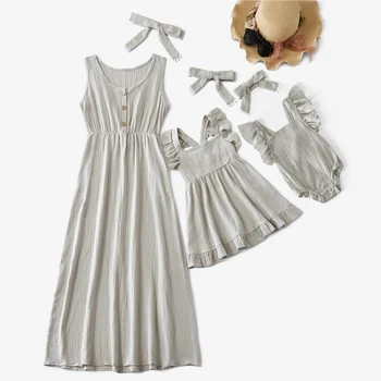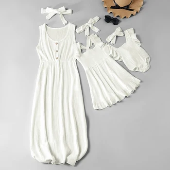 Mère et enfants décontracté bouton robe solide correspondant mignon bébé barboteuse robe d’été maman bébé famille vêtements tenues robe en coton